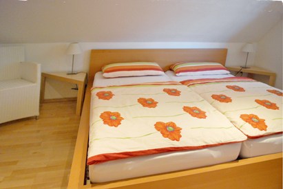 Erdgeschoss mit offener Küche, Essbereich und Sitzecke mit Kamin. Bad (Dusche, WC), Haus- wirtschaftsraum mit Waschmaschine. Einbauküche mit Kühl- Gefrierschrank, E-Herd mit Ceranfeld, Geschirrspüler, Kaffeemaschine, Wasserkocher, Toaster, Bügeleisen. Fernseher, Sat-Anlage, DVD-Spieler, Musik-Anlage. Pflegeleichte, hygienische Bodenbeläge (Fliesen/Parkett) mit Fußbodenheizung. Zwei Schlafzimmer mit Doppelbett, ein weiteres Bett im Spitzboden. Zwei Duschbäder mit WC. Gartenstühle und -Tisch, zwei Terrassen. Stellplatz für einen PKW.